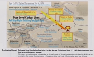 Si alguien piensa que todo esto es conspiracionismo y pura propaganda anticomunista le recomiendo el documental Death on the Silk Road (1998) que ganó en su día el Rory Peck Award y, por el momento, sigue disponible en Nicovideo y quizá algún otro portal de internet. Por cierto que en los años ochenta, poco antes de la olvidada masacre de Tiananmen, un japonés amigo mío fue conminado en Pekín por agentes chinos que se hicieron pasar por diplomáticos japoneses para que les entregara un cristal sospechoso de color violáceo que encontró en una de las carreteras que pasan cerca de la Ruta de la Seda. Posiblemente se trataba de alguna sustancia fundida y luego recristalizada por las altas temperaturas de una explosión nuclear. Todo esto sucedió en unos años en que, al hilo del restablecimiento de las relaciones diplomáticas con el gobierno de Pekín y la interrupción de las mismas con la dictadura derechista de Taipei, tanto Japón como muchos países occidentales ofrecían ayudas al desarrollo a la dictadura comunista. Que las ha utilizado para su carrera armamentística y para su conquista espacial.